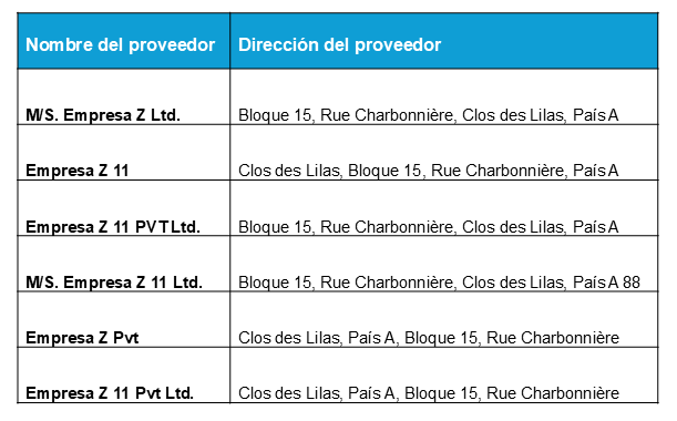 El resultado fue un código de proveedor, un identificador único asignado a todos los proveedores en función de características fundamentales como el nombre, la dirección y el país. Por ejemplo, las variaciones en los datos del proveedor que se enumeran a continuación, todas ellas referidas al mismo proveedor, se integran en un único código : A88000001