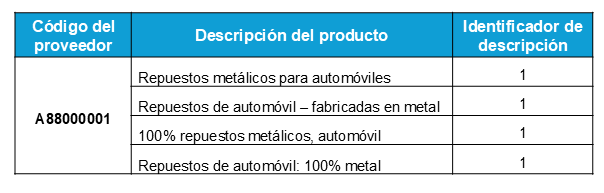 Este identificador de descripción vincula las descripciones diversas de un mismo producto suministrado por un mismo proveedor a una única categoría analizable. Tomando como referencia el ejemplo anterior, el proveedor A88000001 describe los mismos repuestos de automóvil de diversas maneras, tal y como se muestra en la tabla siguiente.