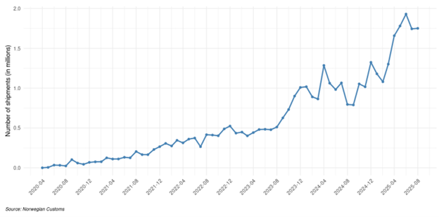 Han pasado cinco años tras la introducción del régimen VOEC. Ahora es muy conocido y las partes interesadas relevantes lo han integrado en la cadena logística. Al mismo tiempo, su ámbito de aplicación está aumentando significativamente, especialmente desde el otoño de 2023. Hoy hay alrededor de 1,75 millones de envíos mensuales sujetos al VOEC. Esto significa que aproximadamente el 80 % del total de envíos para destinatarios privados con un valor inferior a 3.000 NOK se benefician del régimen VOEC.