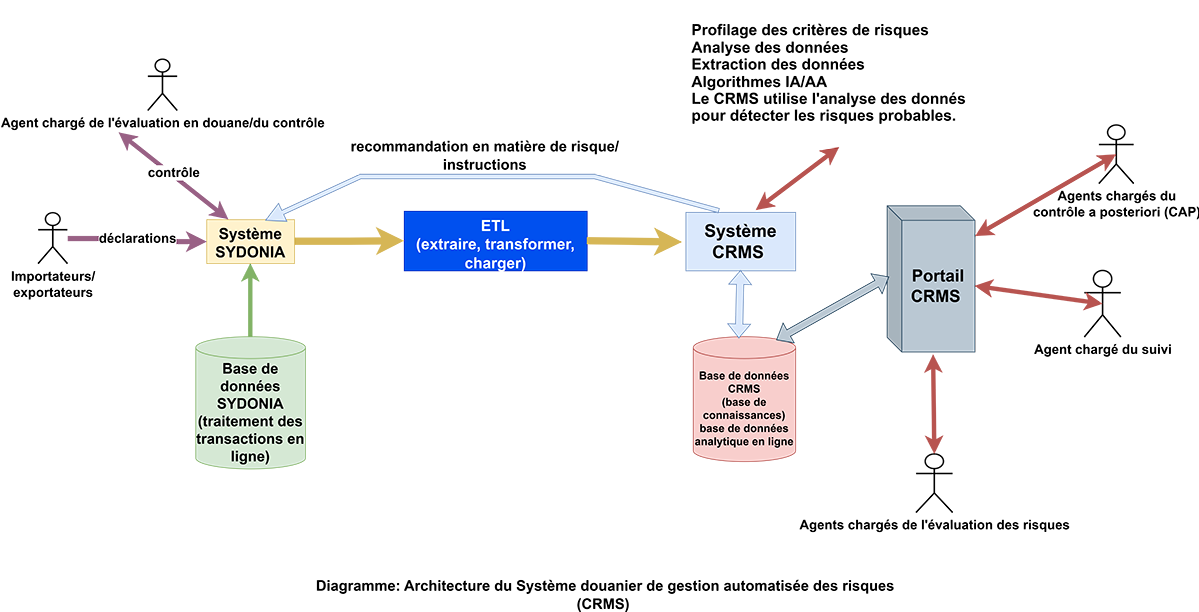 Dans le système actuel, lorsqu’un déclarant soumet une déclaration, le CRMS extrait en temps réel du SYDONIA les informations y figurant et traite les données saisies en appliquant les modèles analytiques. Le CRMS génère alors une série de recommandations qui sont classées, catégorisées et agencées par ordre de priorité. Ces recommandations sont ensuite envoyées aux douaniers à travers SYDONIA World pour qu’ils puissent procéder à leurs vérifications. Les résultats des contrôles a posteriori et des inspections sont systématiquement analysés pour affiner et mettre à jour les paramètres de risque.