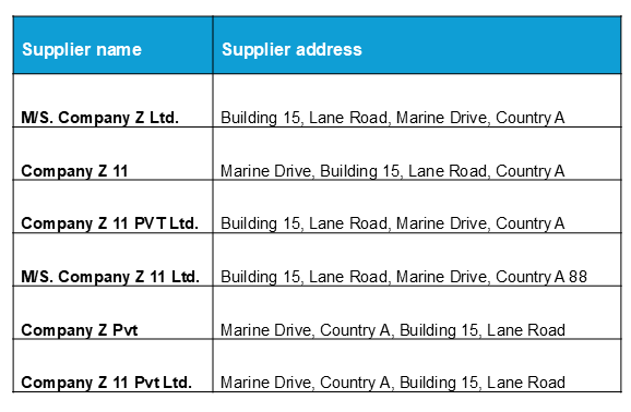 The outcome was a supplier code – a unique identifier assigned based on key attributes such as the name, address and country of the supplier. For instance, the variations in supplier details listed below – all referring to the same supplier – are consolidated under a single code: A88000001.