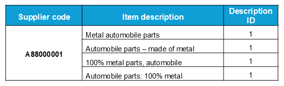 This description ID links variant descriptions of the same commodity supplied by the same supplier to a single, analysable category. Drawing from the example above, the supplier A88000001 describes the same automobile parts in various ways, as shown in the table below.